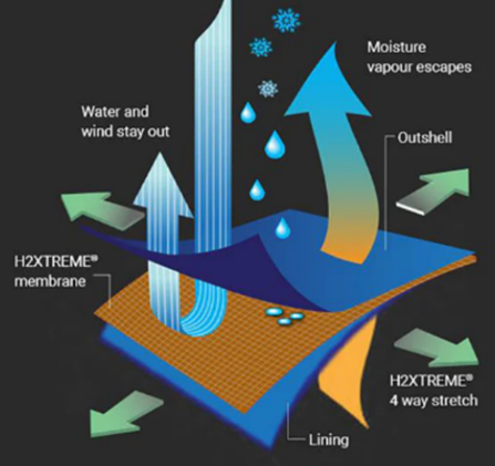 Unlike other chemical coatings which close the pores in the material (making it waterproof but not breathable), H2XTREME has microscopic holes in the fabric which let moisture vapour (i.e. sweat) escape while keeping wind and rain out. Say goodbye to sweaty uphill climbs in the driving rain – H2XTREME will keep you dry and comfortably cool. All in all, a much more pleasant experience for both the wearer and those around them!